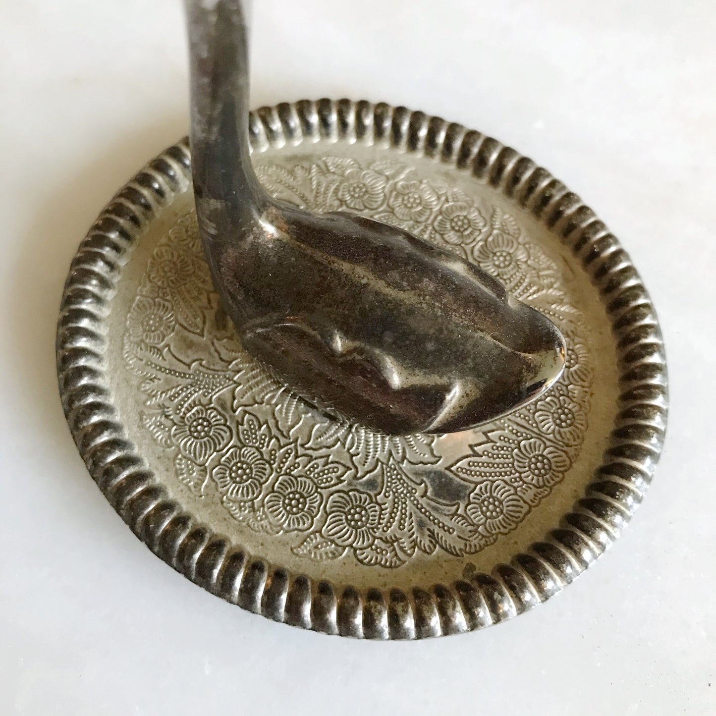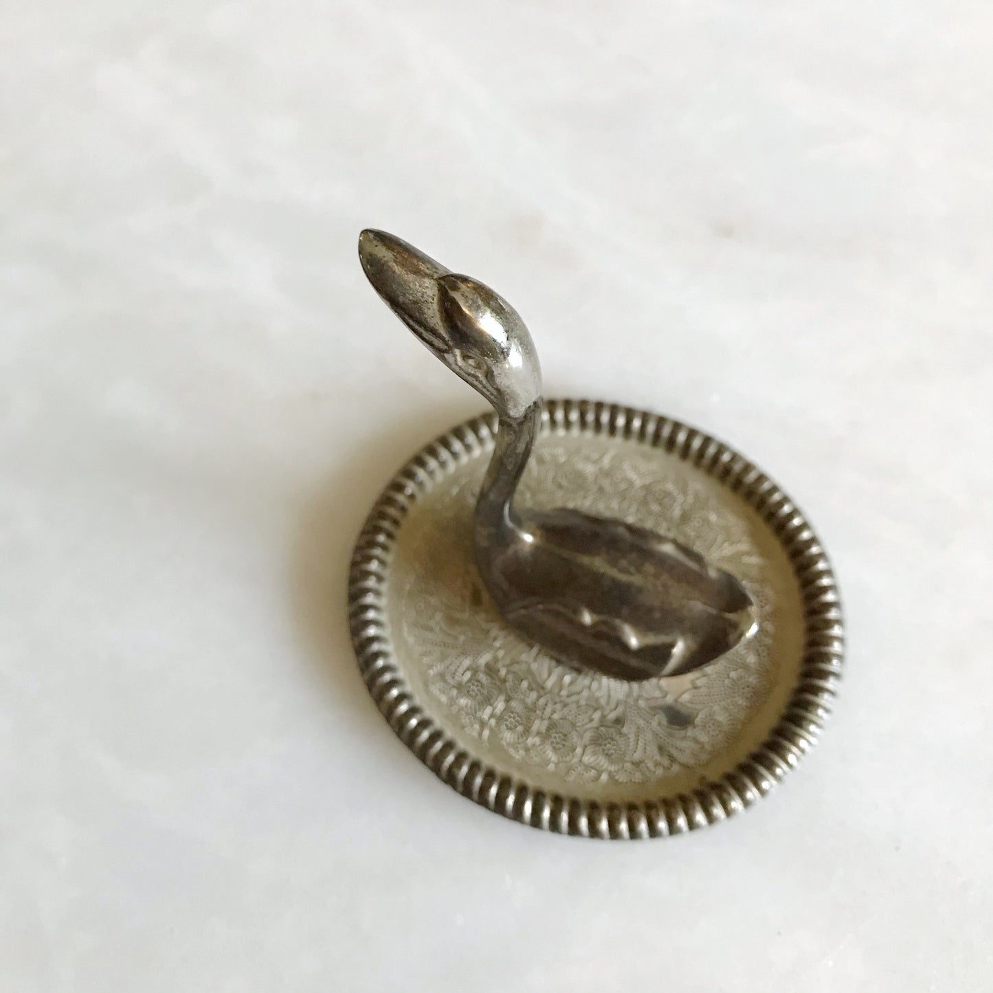 A lovely vintage silver plated swan ring dish! Beautiful patina, but could be polished if you prefer a bright shine.