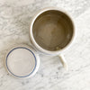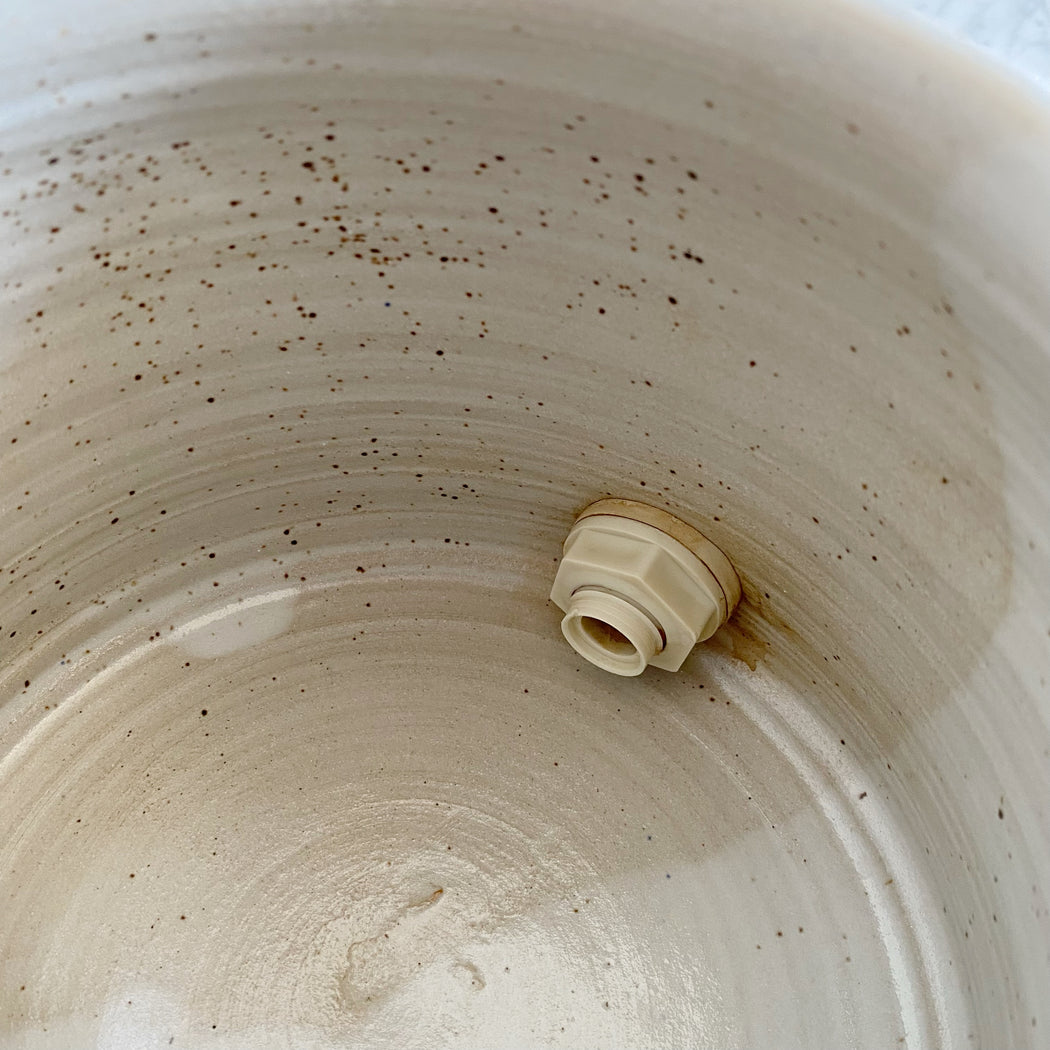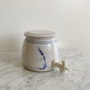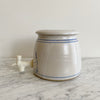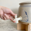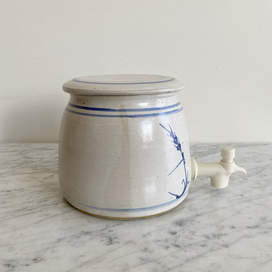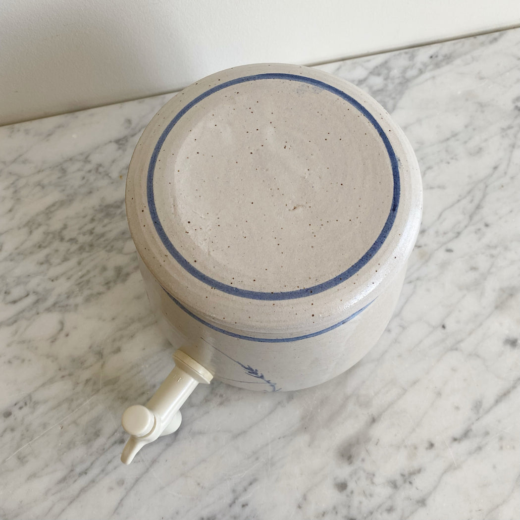 Vintage handcrafted stoneware water dispenser with handpainted designs, and push button spout. It’s a beautiful soft gray body with blue details. It’s a great size to keep on the counter!