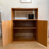 This is a beautiful and versatile vintage teak cabinet, featuring unique "double-hinged" doors with vertical striped detailing, cool wooden handles, and lots of storage space! It could be a great option for a bar setup, as office storage, media storage, or bulky sweater and clothing storage. It could even be a nice landing place in a large entryway or mud room— Keys and mail on top, bins of hats/gloves/reusable shopping bags/etc. below!
