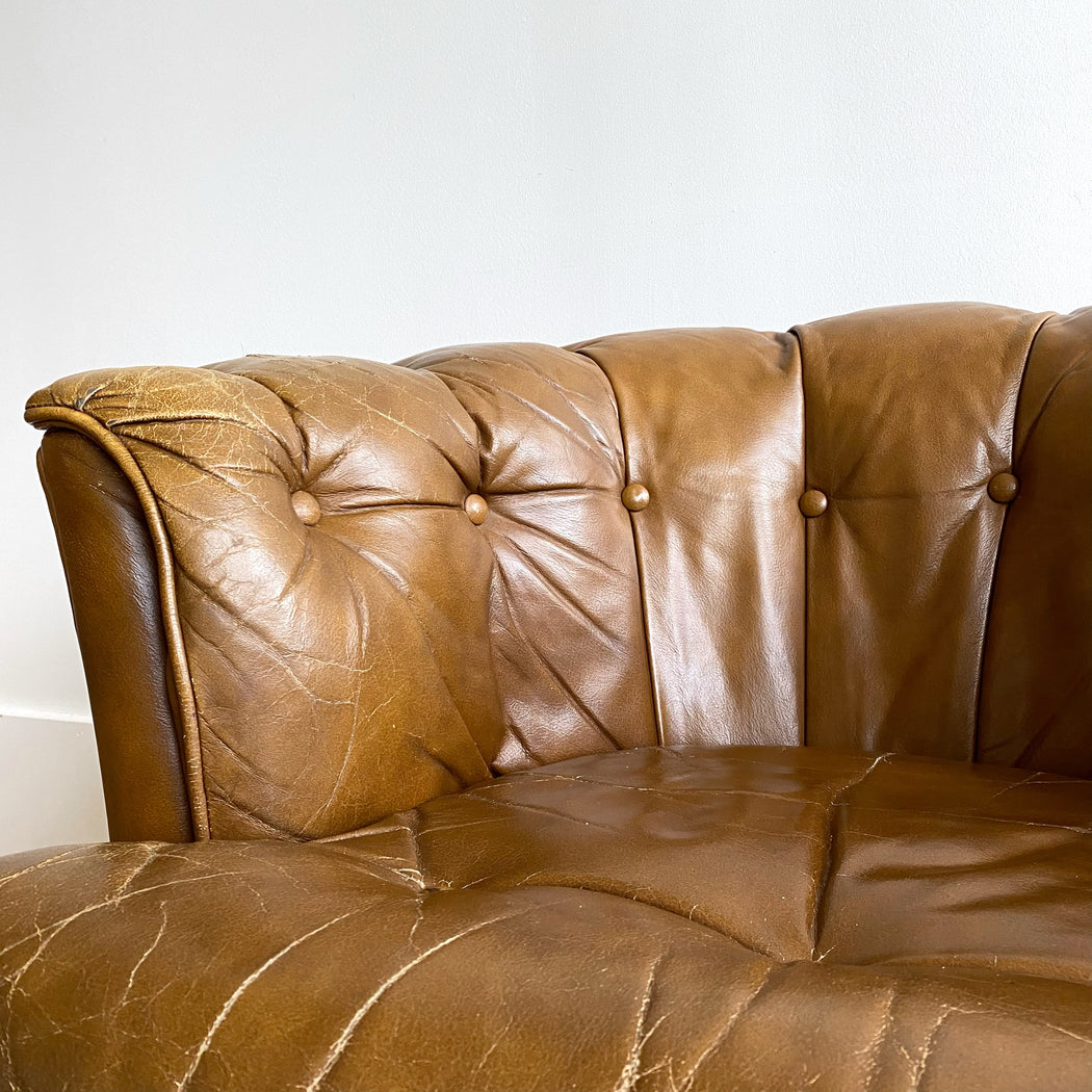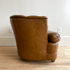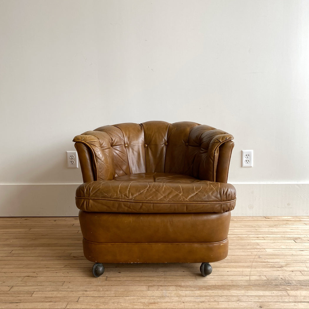 Cozy and comfortable tufted leather swivel club chair with great style. We love the worn-in nature of this chair, with all the crackles and wrinkles, for the beautiful level of character it adds! It is incredibly comfortable and is sure to be a favorite reading spot!