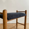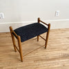 Nice found vintage stool with inky denim blue colored upholstery. A great little bench / stool for an entryway or vanity. It can tuck under a table or anywhere when not in use too.