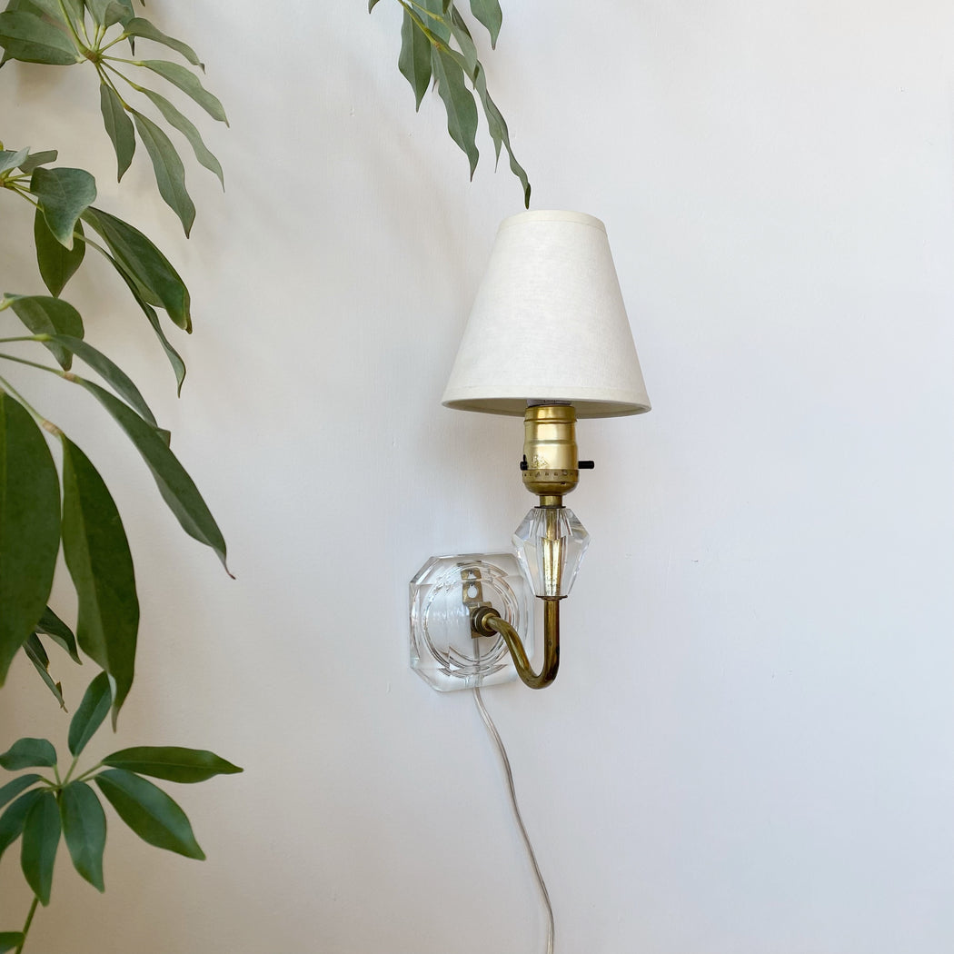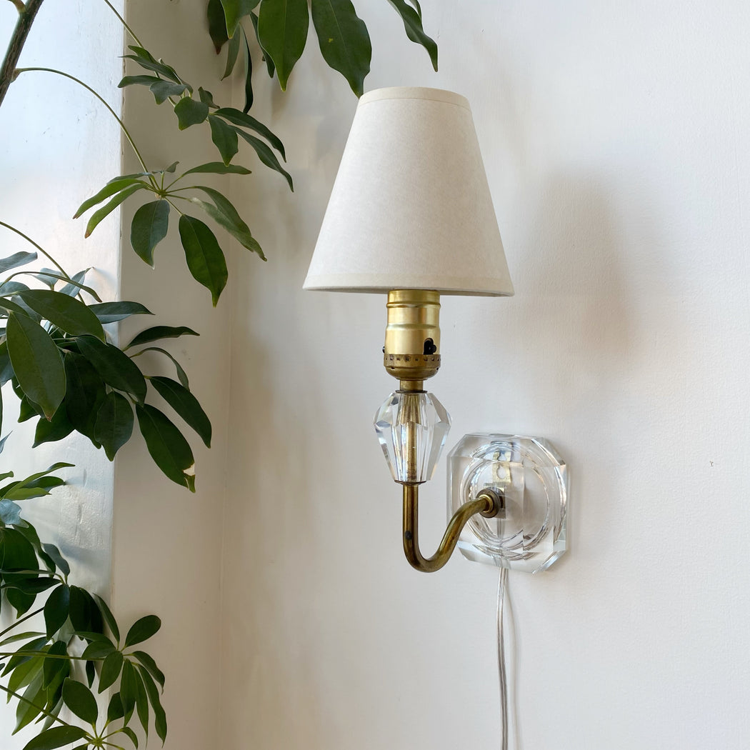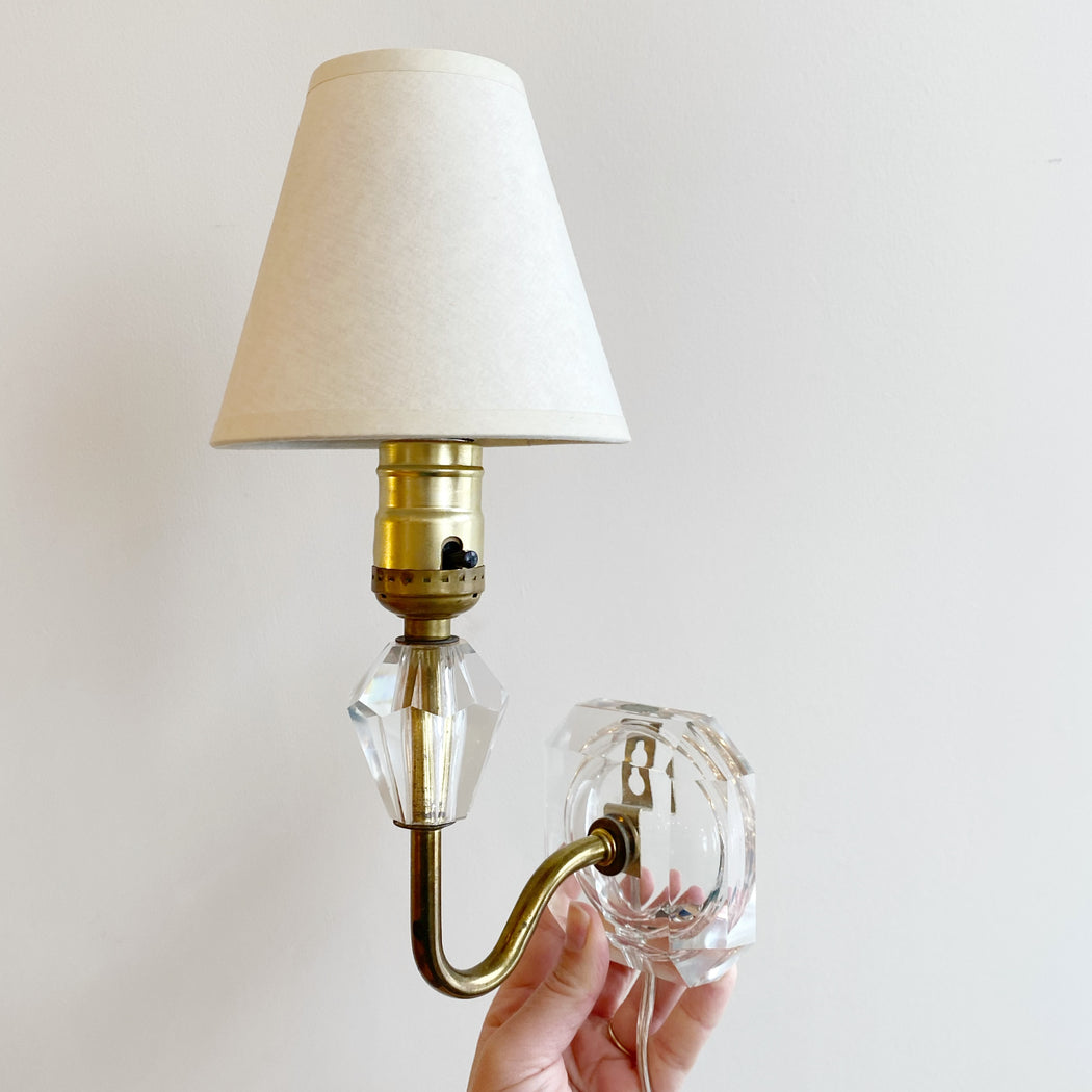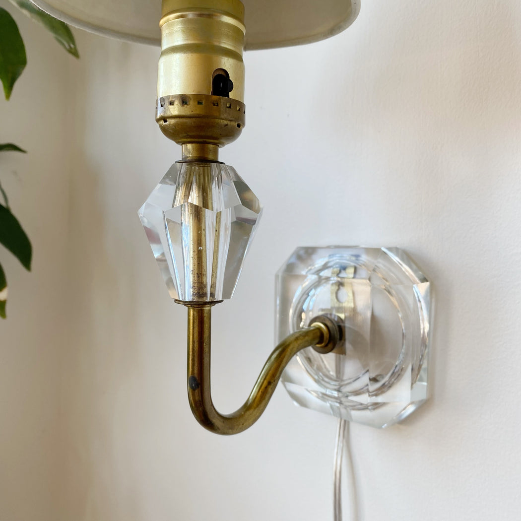 Vintage hand cut crystal and brass wall light sconce. We paired it with a sweet and simple ivory clip-on shade, but it could be swapped out if you have another on hand or made.