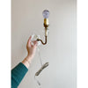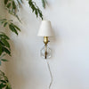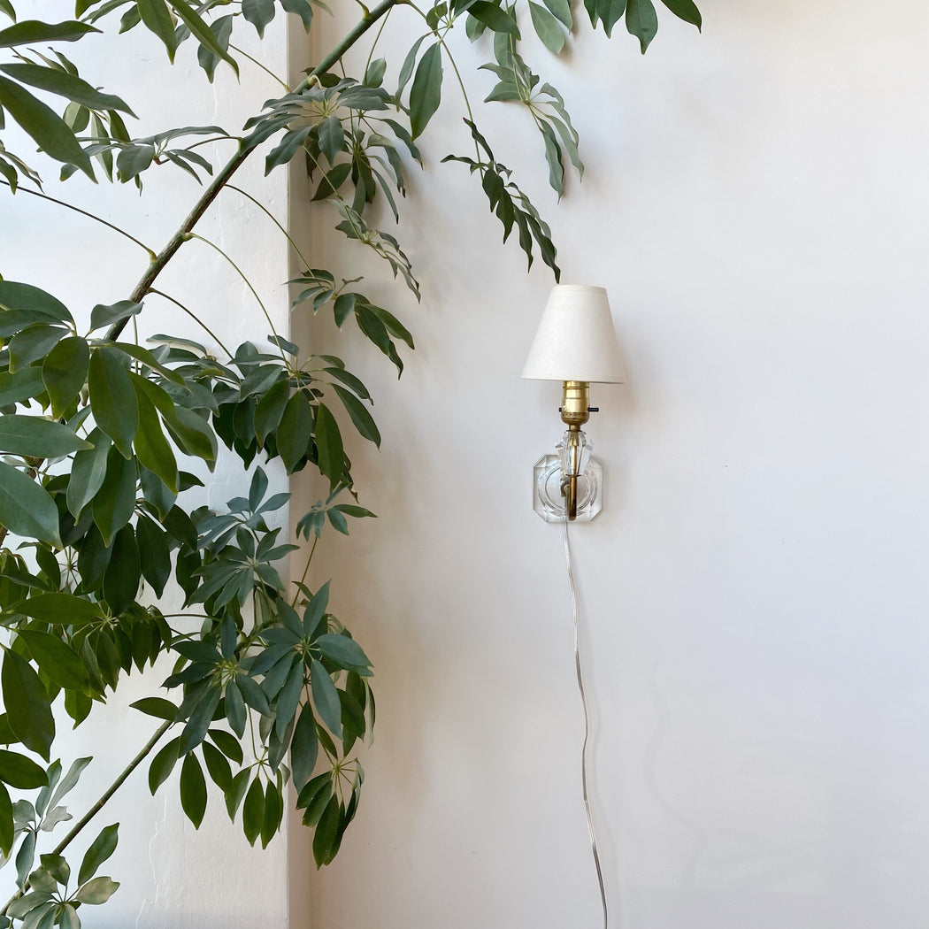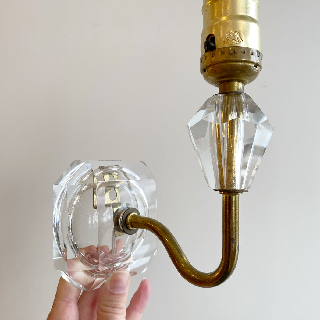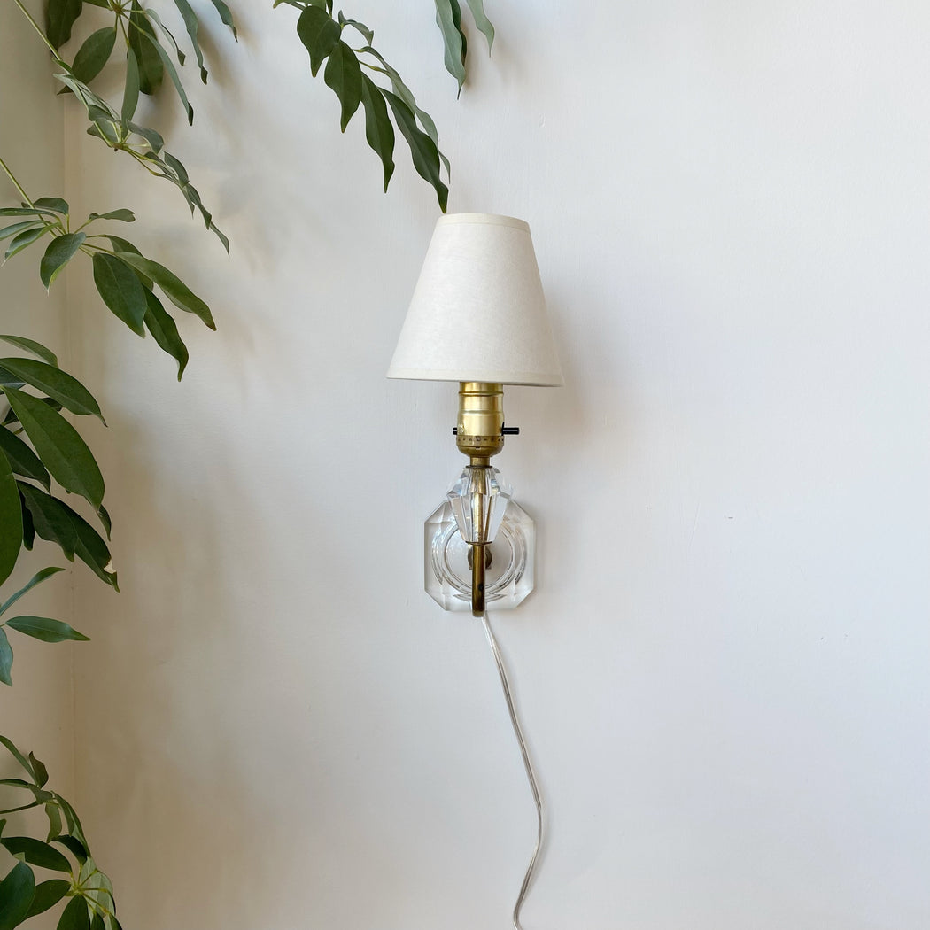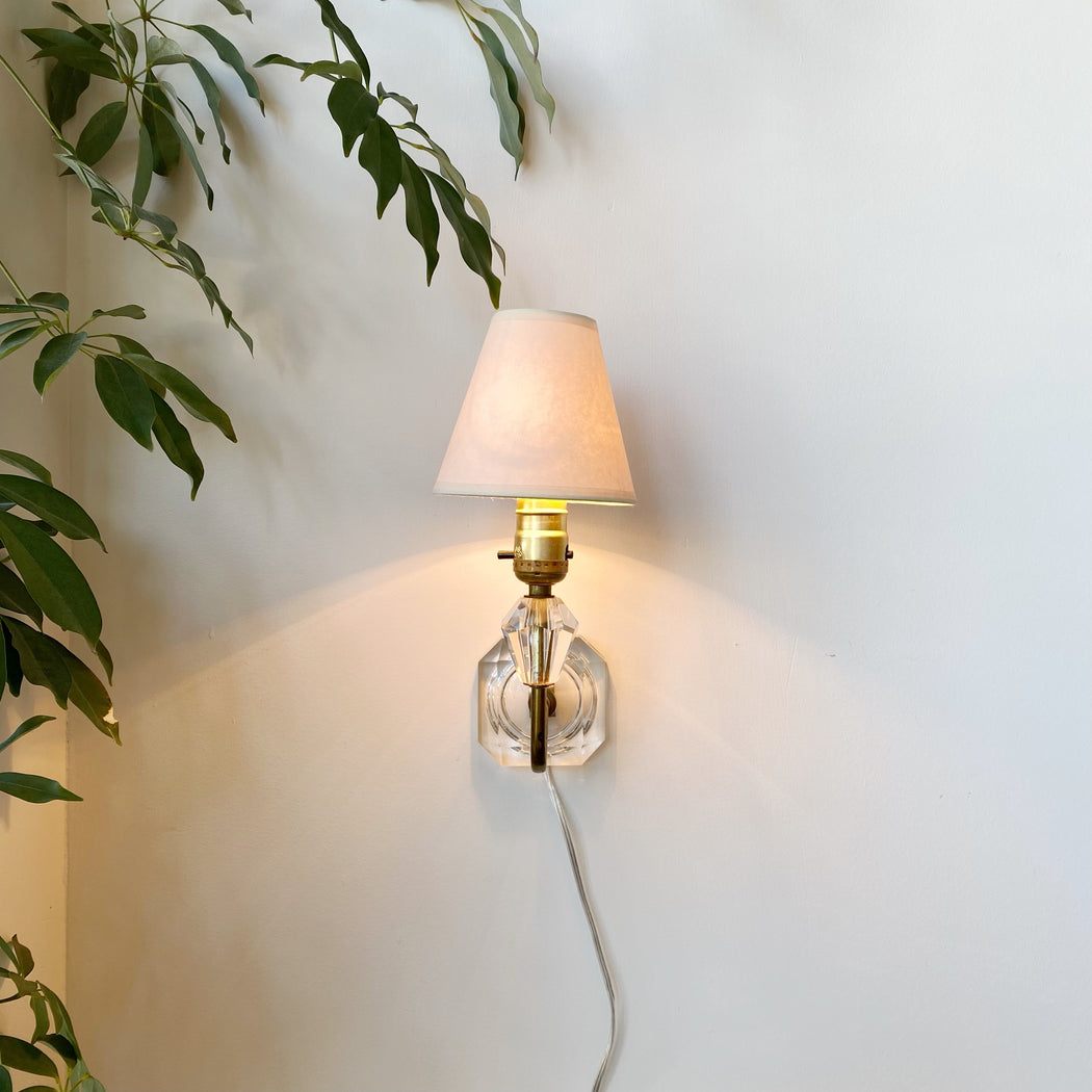 Vintage hand cut crystal and brass wall light sconce. We paired it with a sweet and simple ivory clip-on shade, but it could be swapped out if you have another on hand or made.