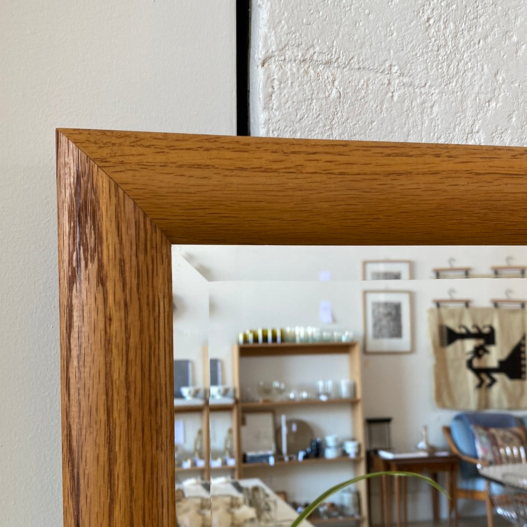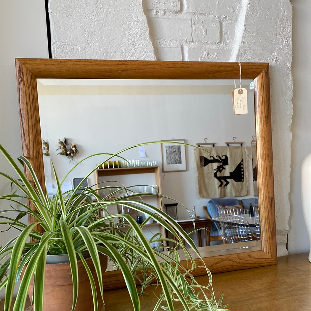 Simply beautiful, this found mirror features a solid oak wood frame and beveled glass mirror. It works well with many styles of decor and is a nice size for many areas: bedroom, bathroom, entryway, etc.