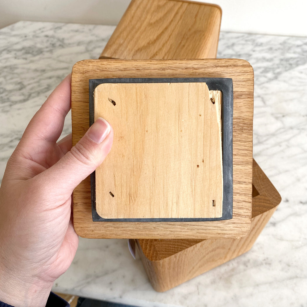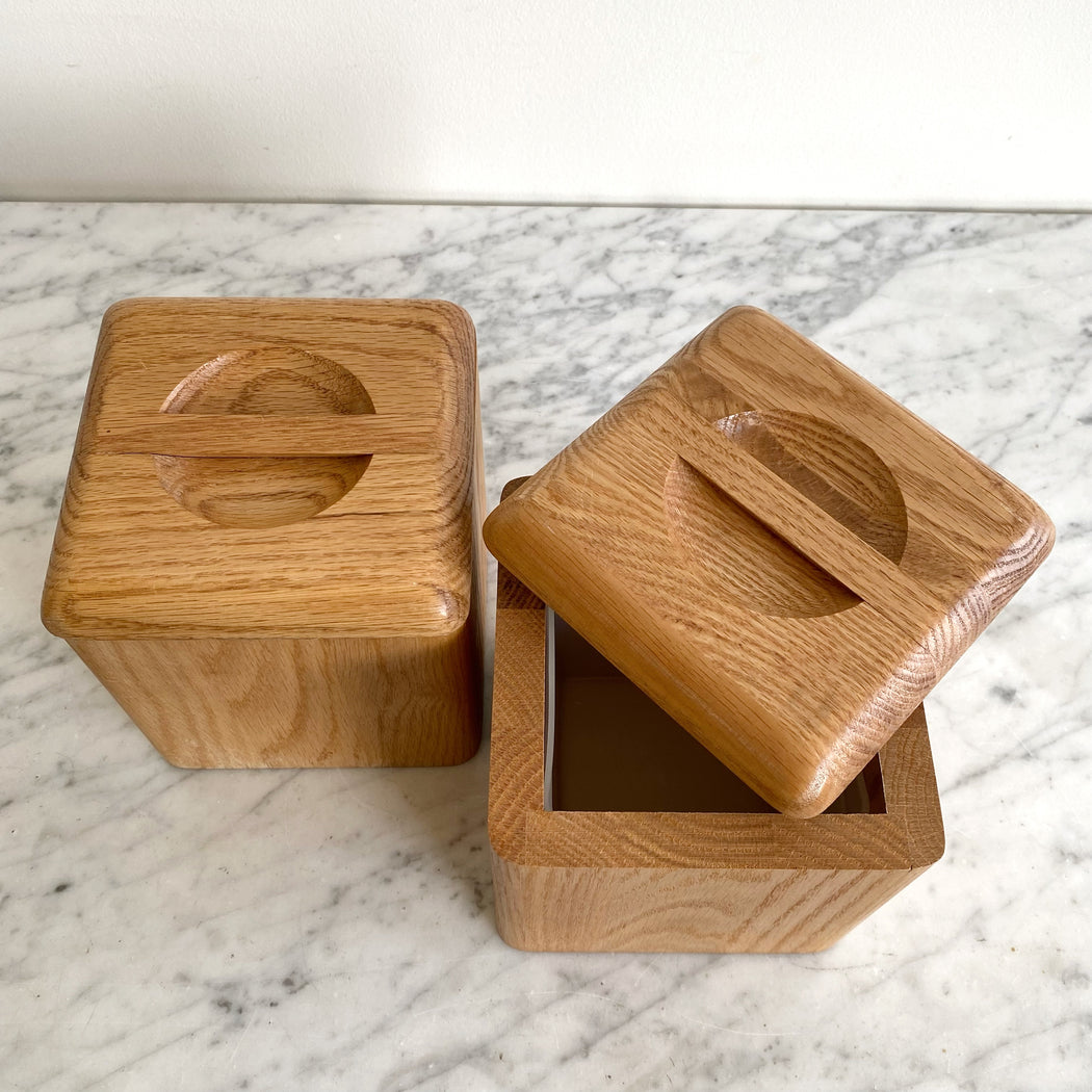 Pair of vintage postmodern wood storage containers with lids and plastic liners. Great for keeping things organized in the kitchen, office, or art room...