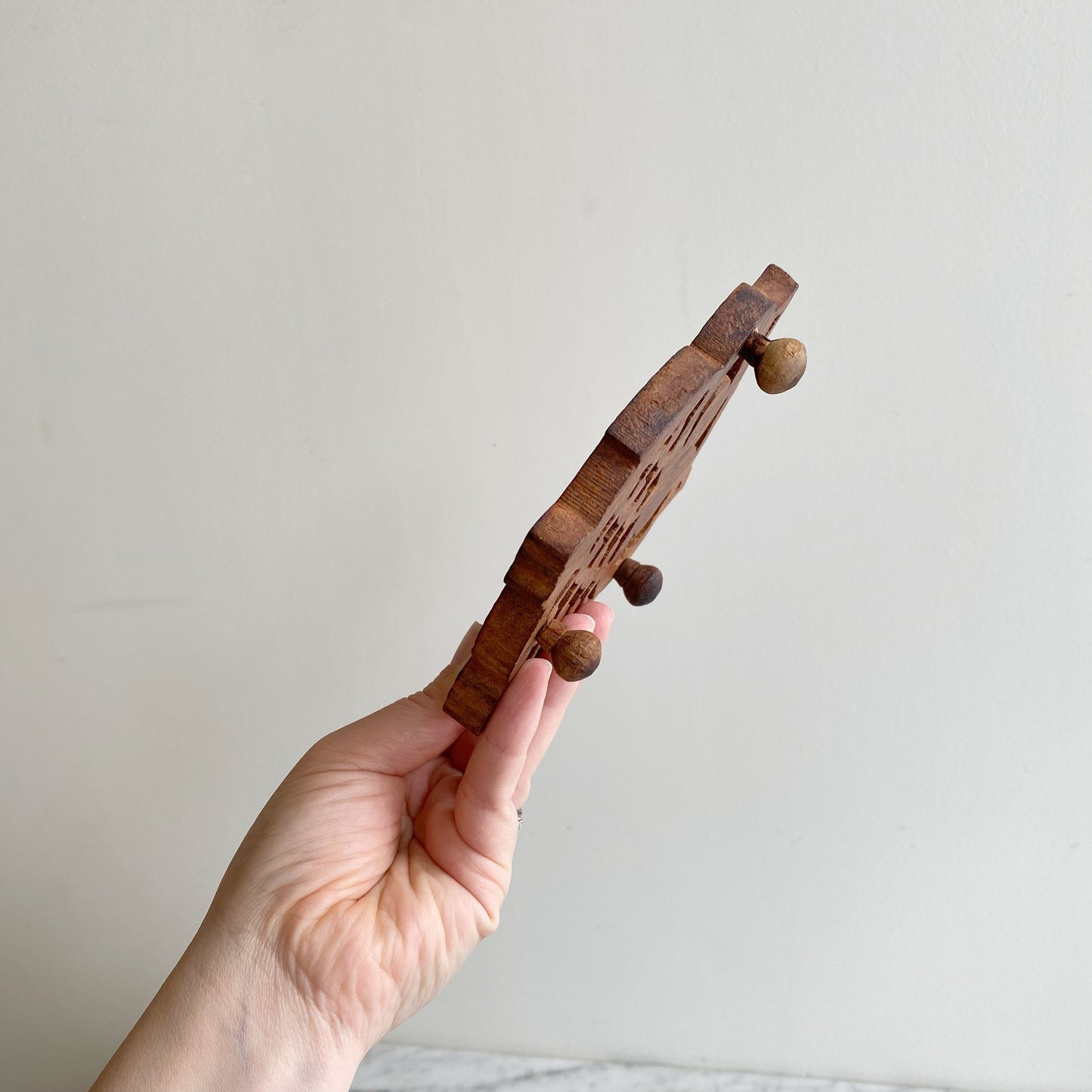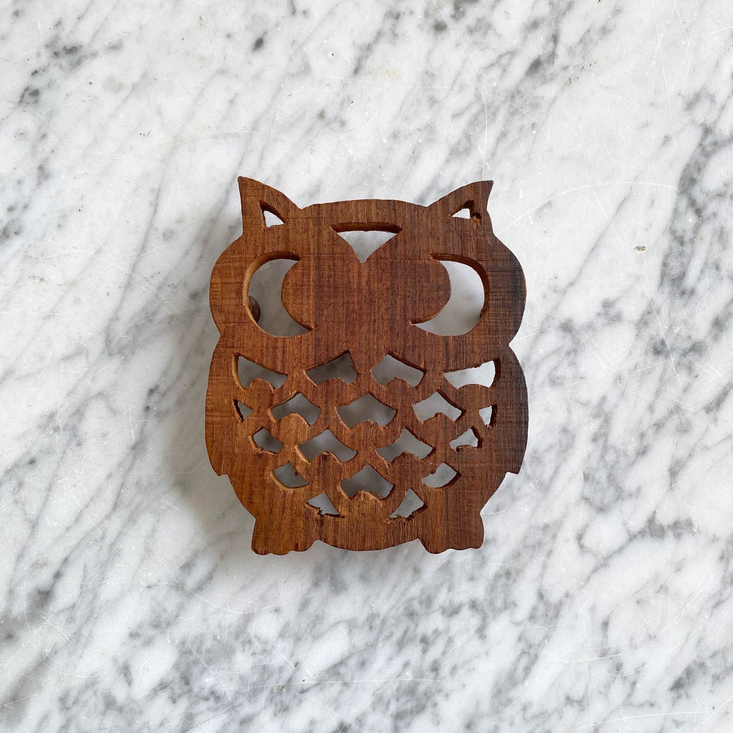 Add some cuteness to your kitchen or dining area with this vintage carved wood owl trivet! It features nice "feather" detailing and three peg feet on the bottom.