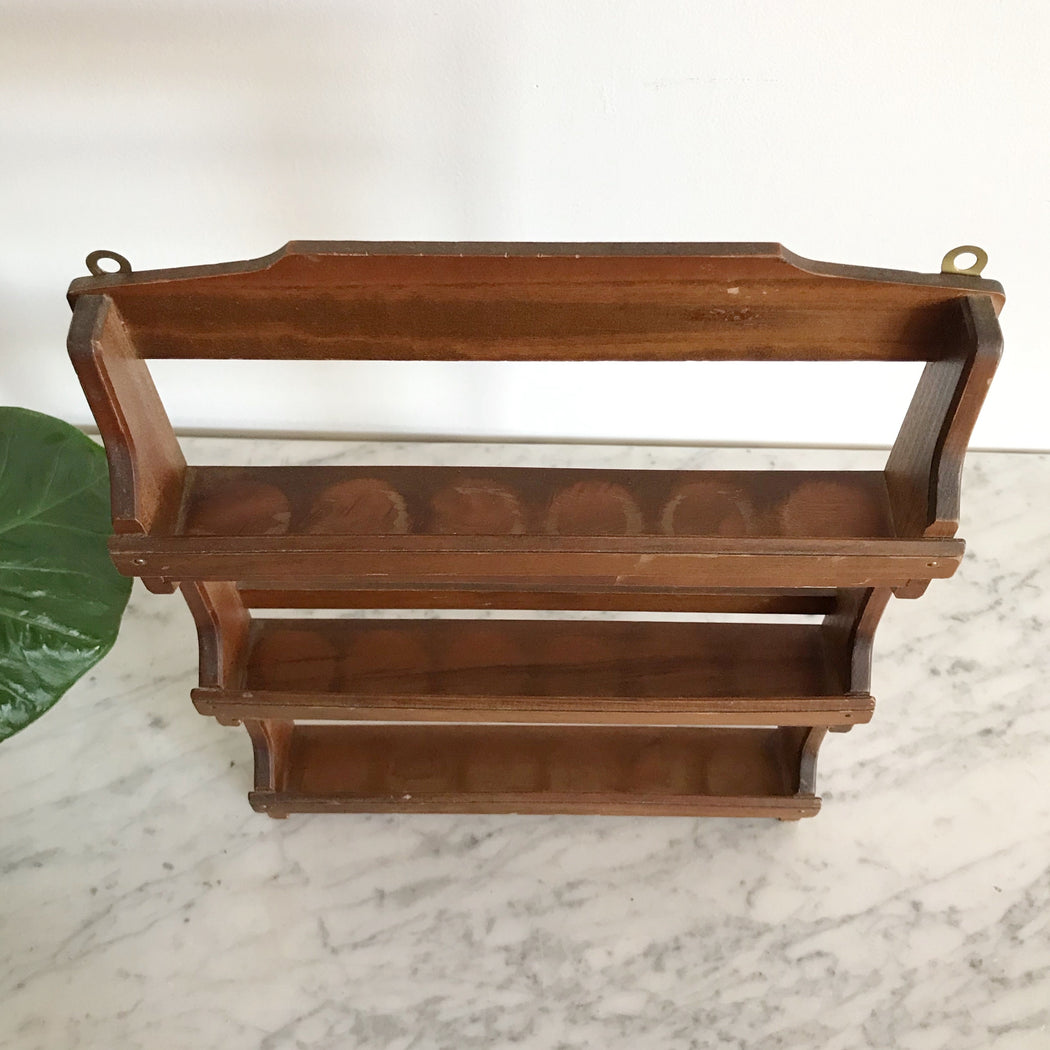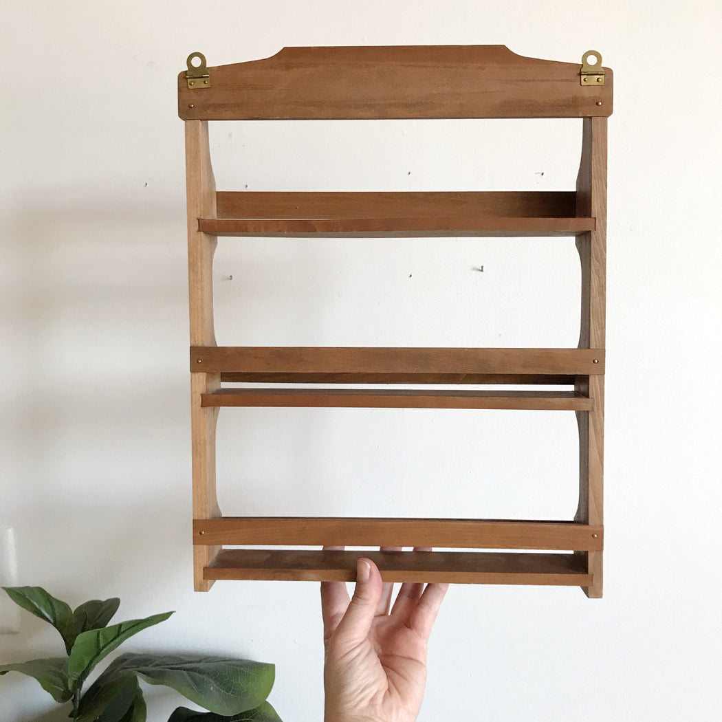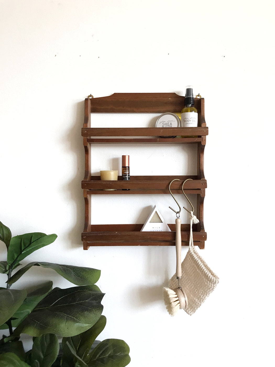Pretty vintage wooden shelving rack. A lovely solution for organizing vanity and skincare items, or as a decorative plant propagation shelf! It could even be a fancy spice rack- add some hooks and hang drying herbs!