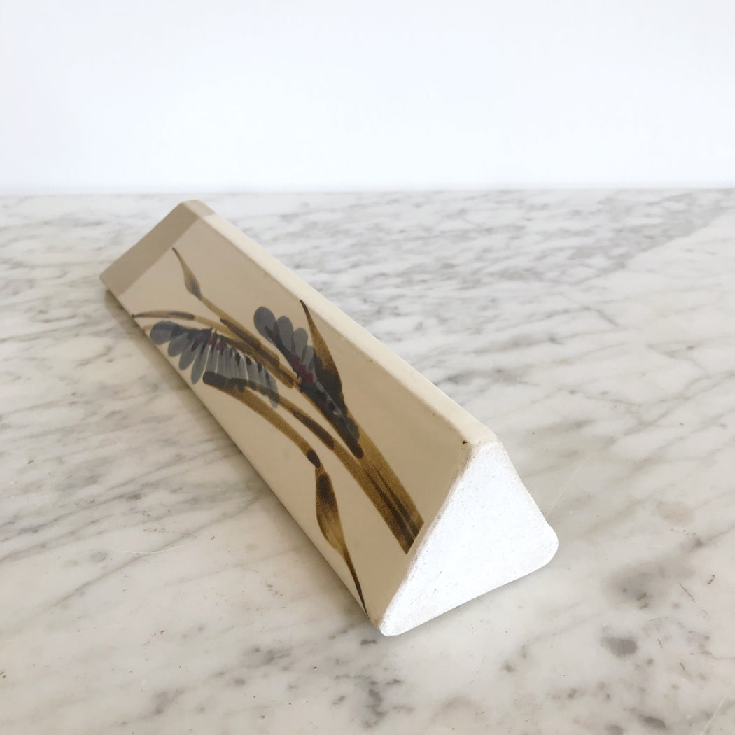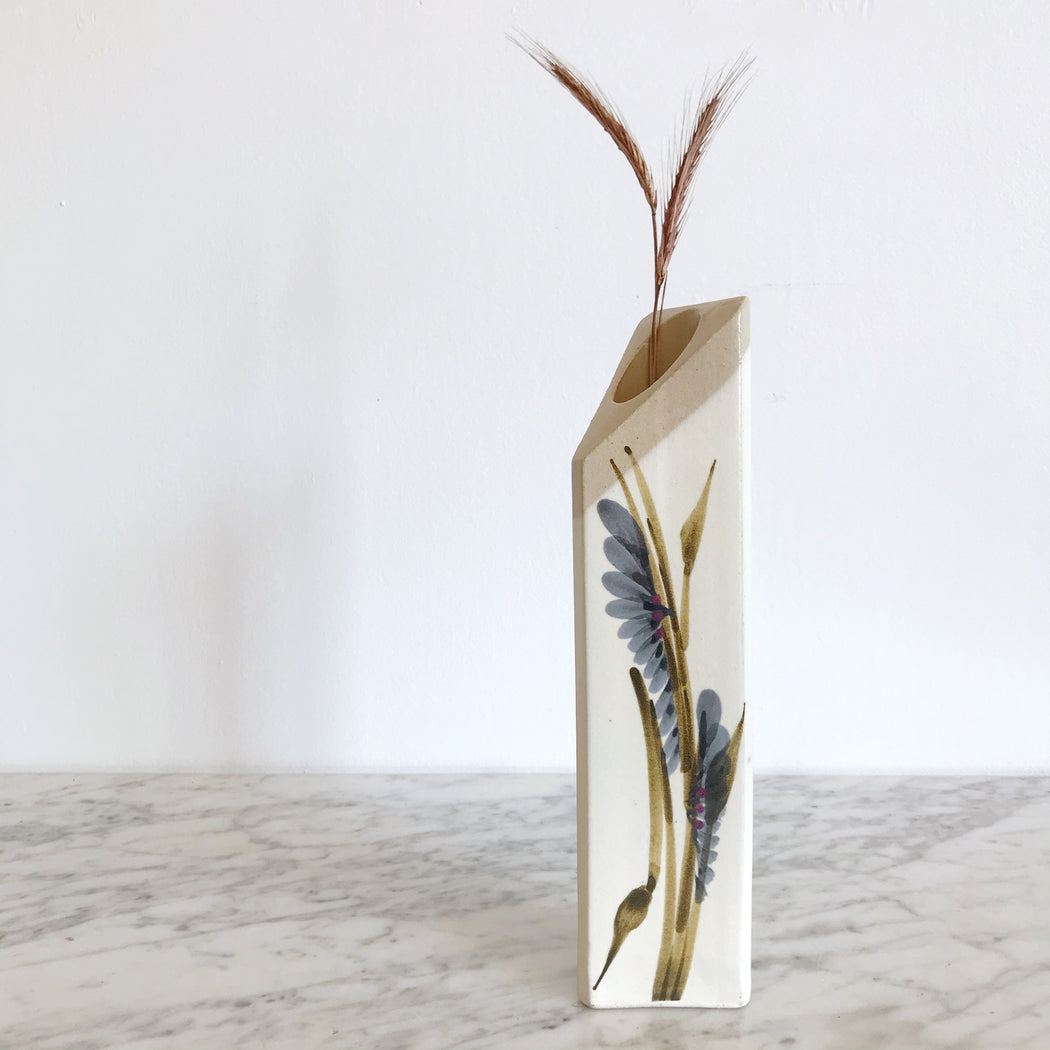 Beautiful handcrafted pottery vase- perfect for your favorite dried stems! It features a unique triangular shape, hand-painted floral design, and can be used free-standing or hanging on a wall.