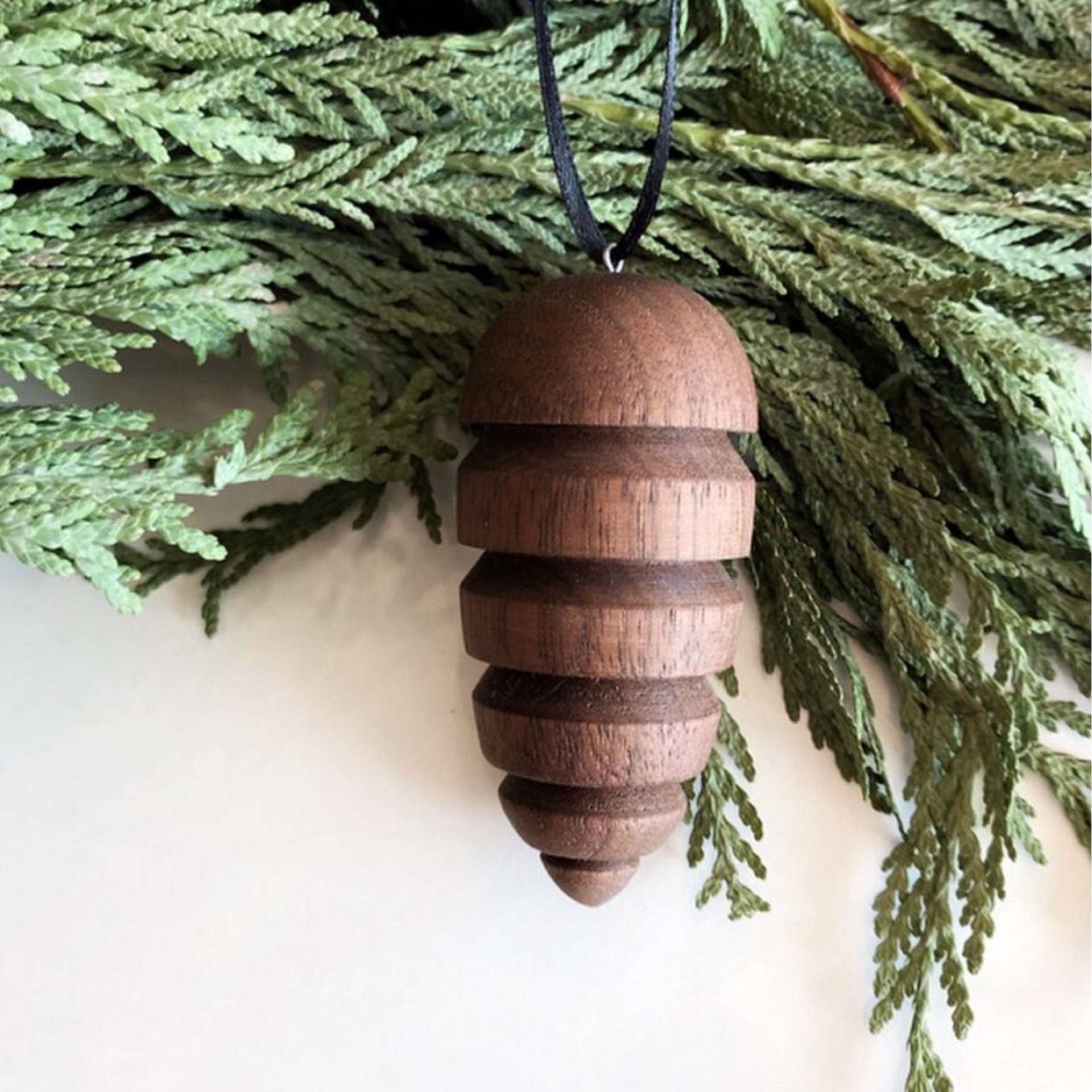 Beautiful turned wood pinecone ornament, handcrafted by local woodworker Ronald Odegaard. So lovely hanging on a tree or plant all year!