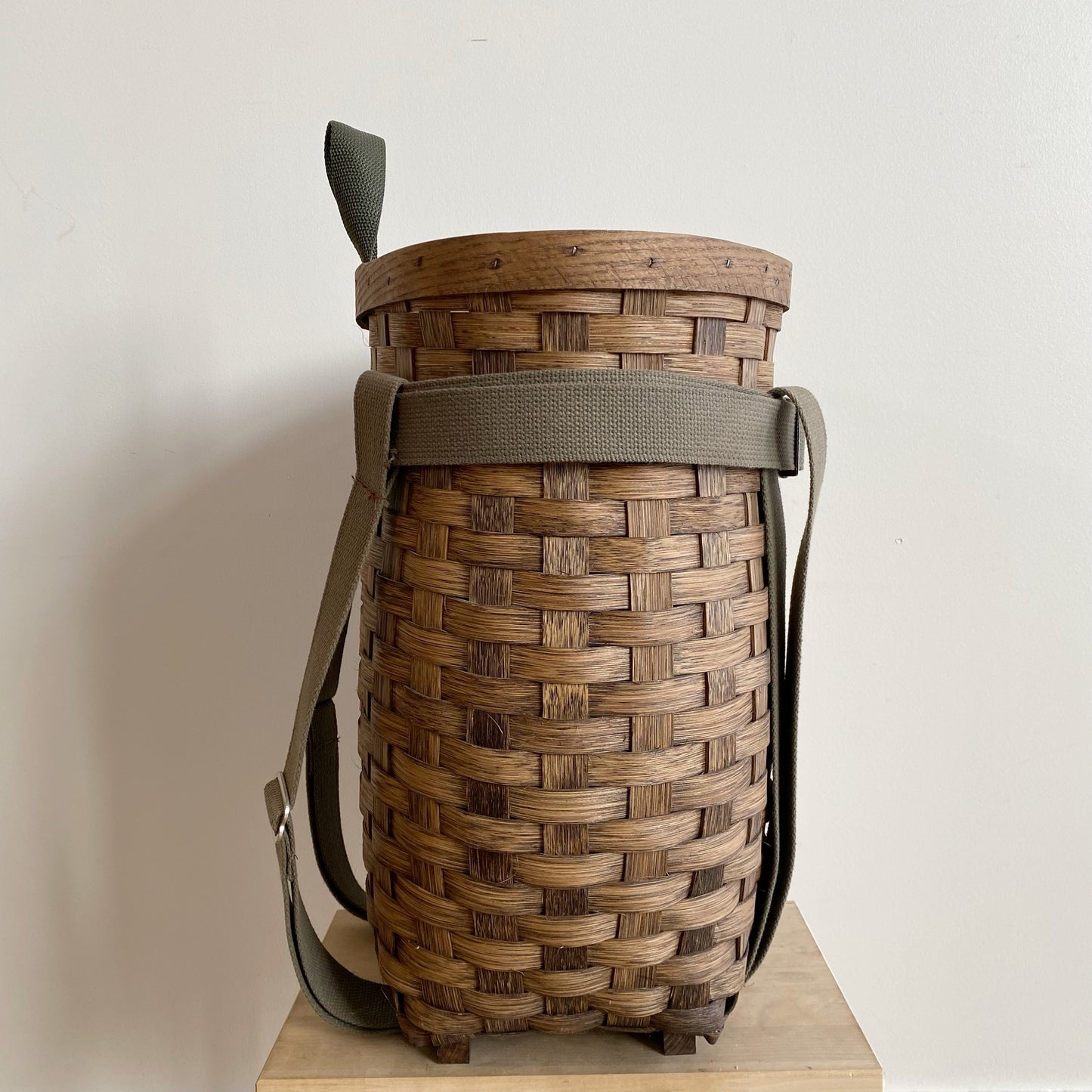 Features include dark woven wood body, heavy duty green canvas harness straps, and metal buckles. There’s a loop handle on top for easy hanging as well.